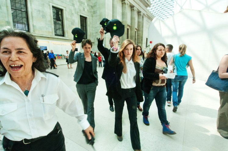 Today at 3.30pm, a dozen members of the “Reclaim Shakespeare Company” theatrical action group launched a surprise piece of protest performance inside the British Museum. They performed a short Shakespeare-inspired piece which criticised the British Museum, the World Shakespeare Festival and the London Olympics over their decision to accept sponsorship from BP in the wake of the Deepwater Horizon drilling disaster and the company’s decision to start extracting highly polluting and destructive tar sands oil in Canada.