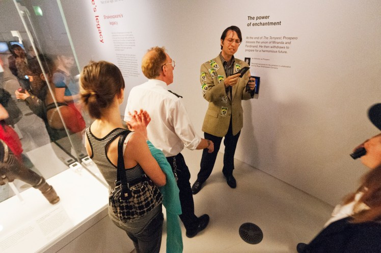 The pop-up performance took place in the Reading Room, surrounded by artefacts linked to Shakespeare’s life and works. Visitors to the BP-sponsored exhibition were treated to a 4-minute guerrilla performance based loosely on Macbeth, in which three BP “executive witches” lure a naive museum director to his doom. The performance was interrupted by an ‘angry customer’ who seemed to be criticising the performance but then turned out to be a protester in disguise, and who finished with the words: “No more o’this, BP, no more / You mar all with your logo / Here’s the smell of oil still / All these shiny exhibits will not sweeten this soiled hand. Oh, oh, oh! / Out, damned sponsor! Out, BP!” These final words were greeted with laughter and applause by museum-goers. The full script can be seen below.
