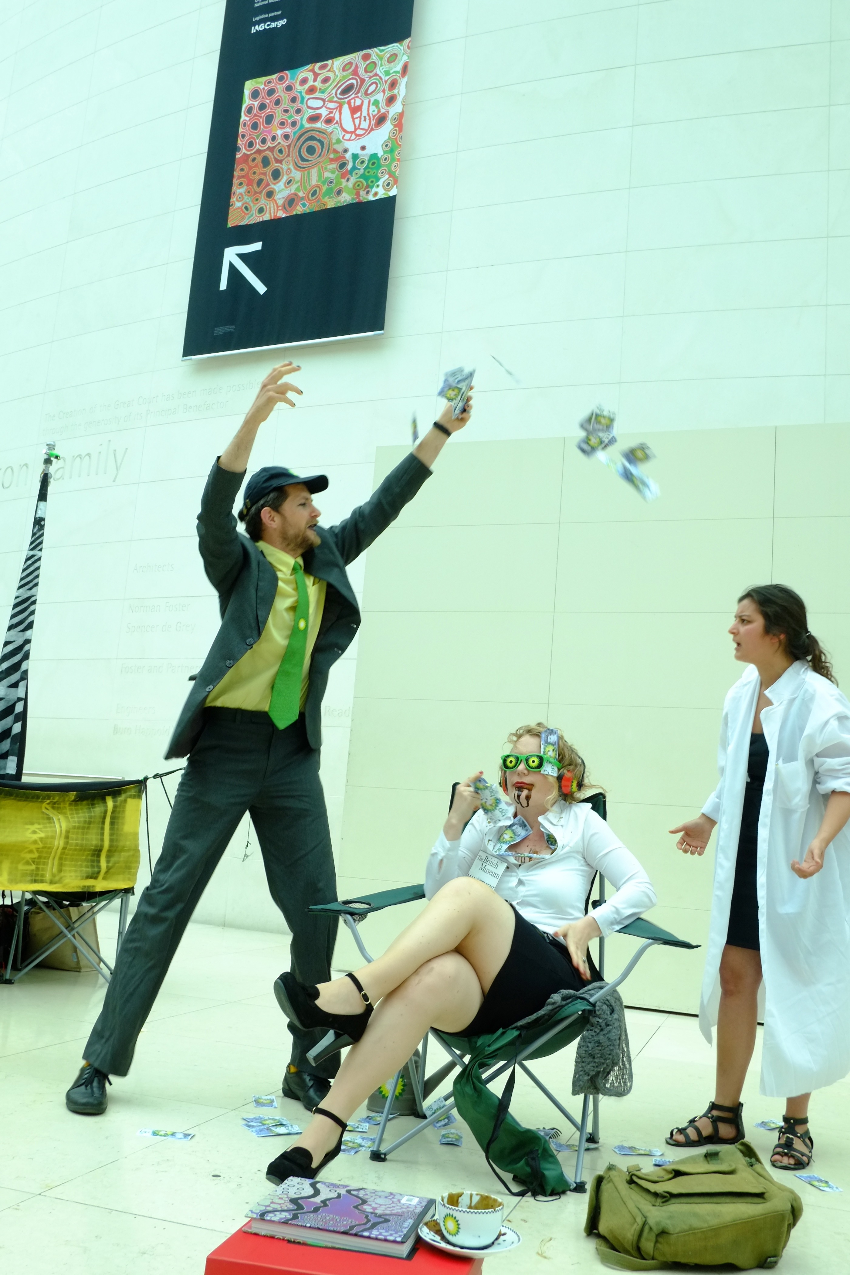 The performance involves a “British Museum management” character sitting on a chair outside the Indigenous Australia exhibition, studiously ignoring the following series of dramatic events: