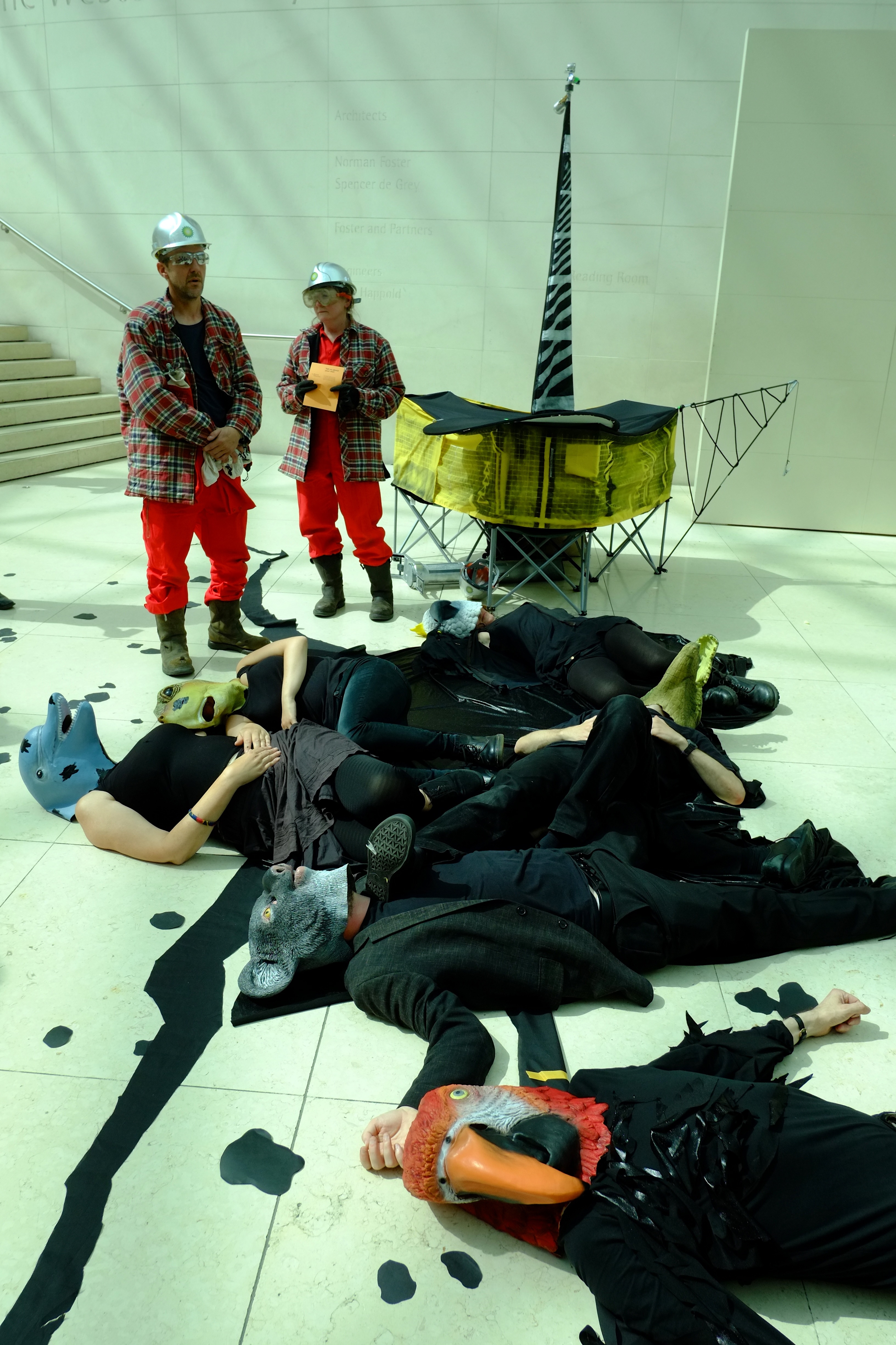 Suddenly, from near the oil spill, animal noises begin, quietly at first, then getting louder. They are mainly whale, dolphin and bird sounds, and as the noises rise, several Creatures appear at the spill site, dressed all in black wearing animal and bird masks. First they swoop around and then they get sullied and stuck in the oil. They gradually drag themselves to the feet of the BM character, squawking and flapping to get their attention. But BP has got there first. The BP character first places BP-branded earmuffs over the BM’s ears so they can’t hear the noise, then proceeds to shoo the dying creatures away from the museum and back to the oil spill where they’re covered with black cloth so they’re almost out of sight [at this point the actors remove the heads and leave them in the spill].