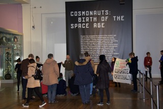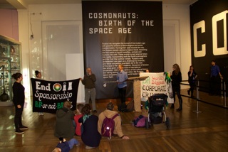 The group took over the entrance to the museum’s Cosmonauts exhibition, currently sponsored by BP, and unfurled banners next to a lectern. Many visitors joined the event and showed their support by joining in discussions and taking flyers.