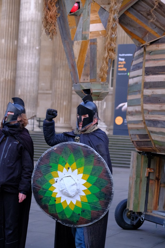 ‘The Troy exhibition has inspired us to create this magnificent beast, because the Trojan Horse is the perfect metaphor for BP sponsorship. On its surface the sponsorship looks like a generous gift, but inside lurks death and destruction. This is our 40th performance intervention at the British Museum: for eight years our peaceful creative protests have been dismissed and the museum has continued to back BP. Now the planet is literally burning. So we invite everyone to come along to our mass action tomorrow and make sure the museum can no longer ignore the fact that, in order to have a liveable planet, BP Must Fall.’