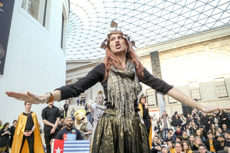 It marked the end of three days of protest and action organised by the activist theatre group BP or not BP? The action began when activists hauled a 13-foot Trojan Horse into the museum’s courtyard on Friday morning and intensified yesterday when around 1500 people flooded the museum in a mass creative protest against its BP deal and its colonial practices – the biggest protest to target the museum in its 260-year history. The Trojan Horse remained in the museum courtyard from Friday morning to Saturday evening, with two “actor-vists” sleeping inside it on Friday night. It left shortly after the start of the artmaking in the Great Court, meaning that protesters were occupying the museum’s grounds for a total of 51 hours. The performers were targeting BP’s sponsorship of the museum’s current Troy: Myth and Reality exhibition.